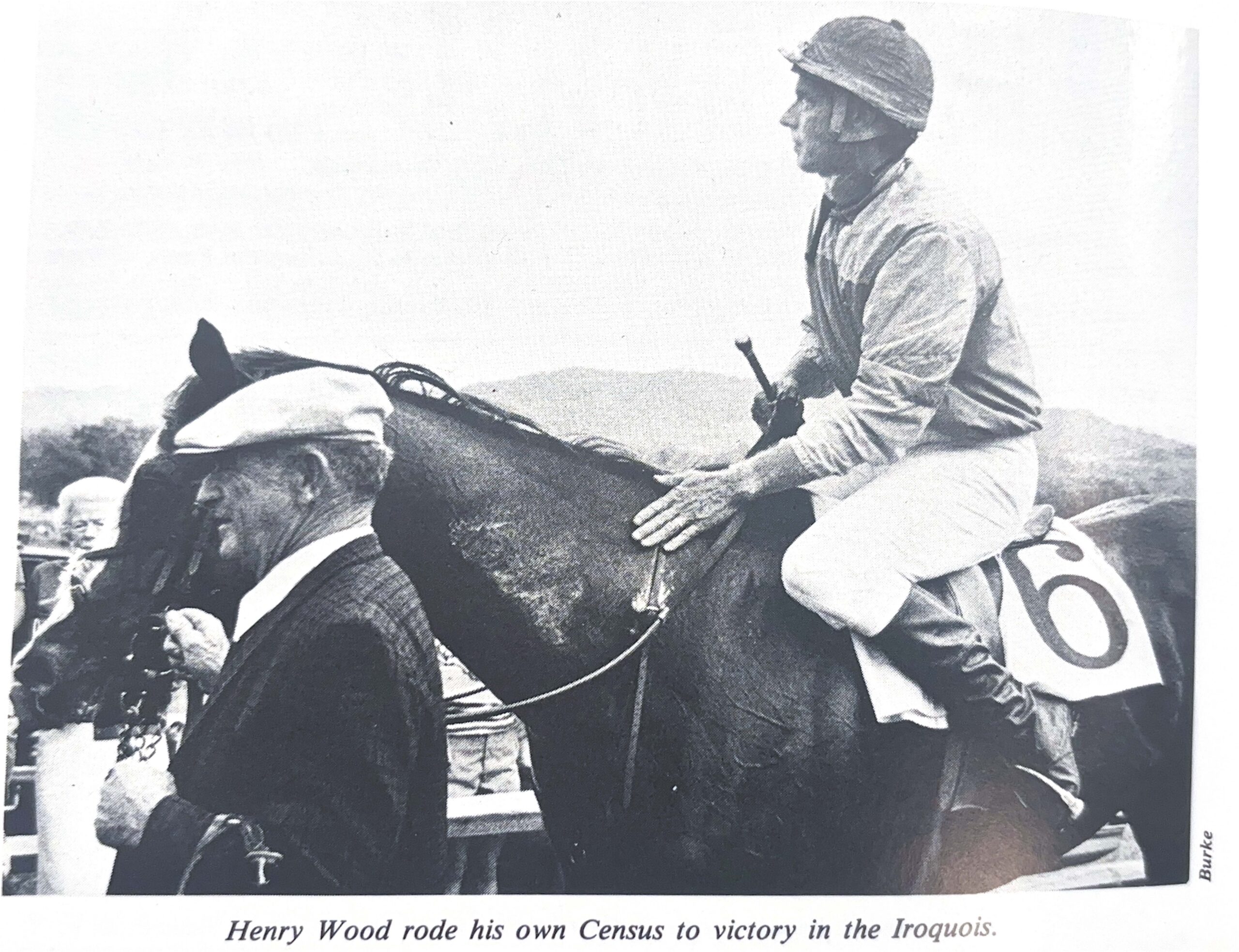 Leo inquired about a three-year old claimer named Census. Census possessed class and stamina, holding the track record at Aqueduct for 1 5/8 miles on the dirt track. Henry approved of the chestnut gelding’s physical appearance and asked Frank if he could sit on him for a gallop. The reply from Frank was a terse “no,” but he acquiesced when Leo asked to gallop the horse. After a spin around the Belmont training track, Leo recommended the purchase of Census to Henry and the deal was struck. Janet Elliot became the neophyte ‘chaser’s trainer. In 1983, Henry Wood rode his own Census to victory in the 1983 Iroquois! It was the culmination of a plan hatched by Henry Wood and his name is forever etched on the historic trophy.